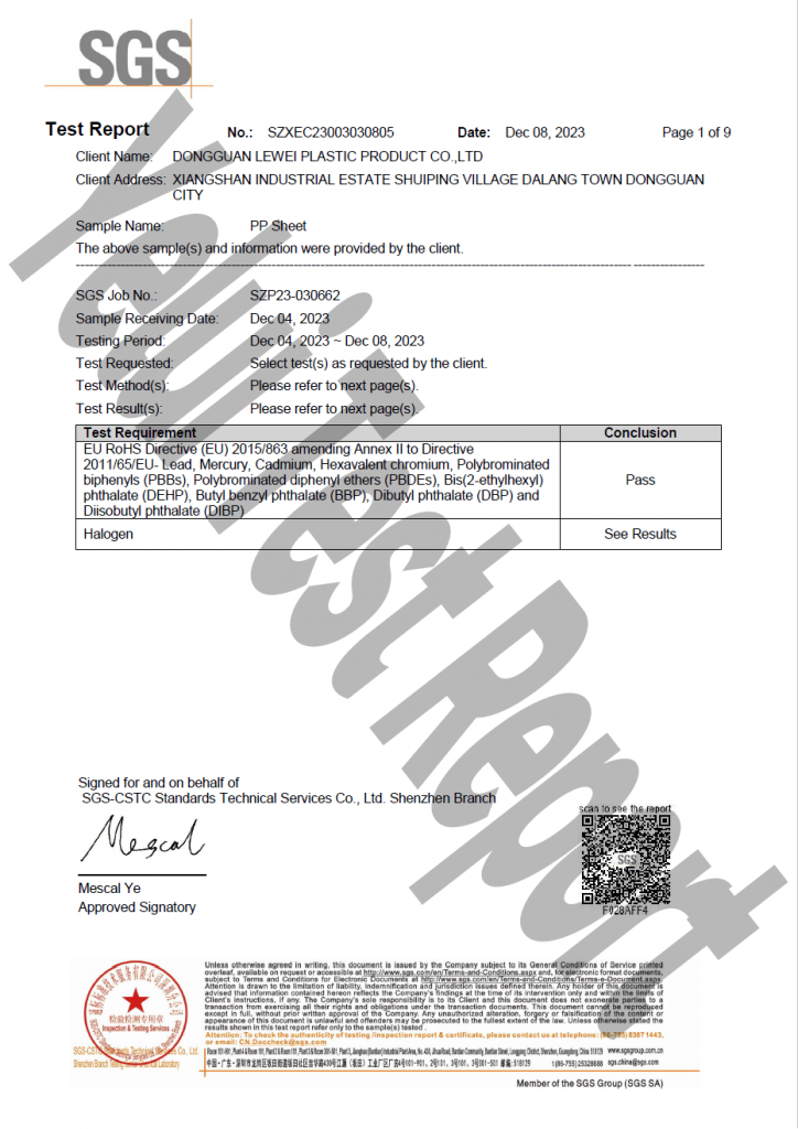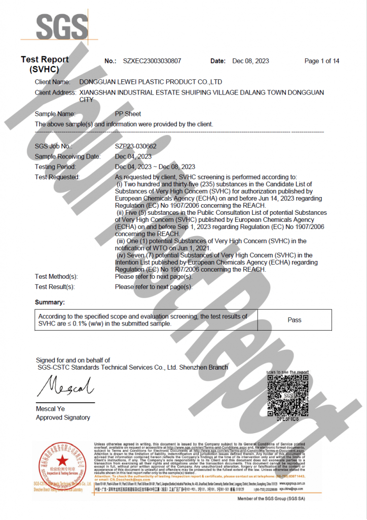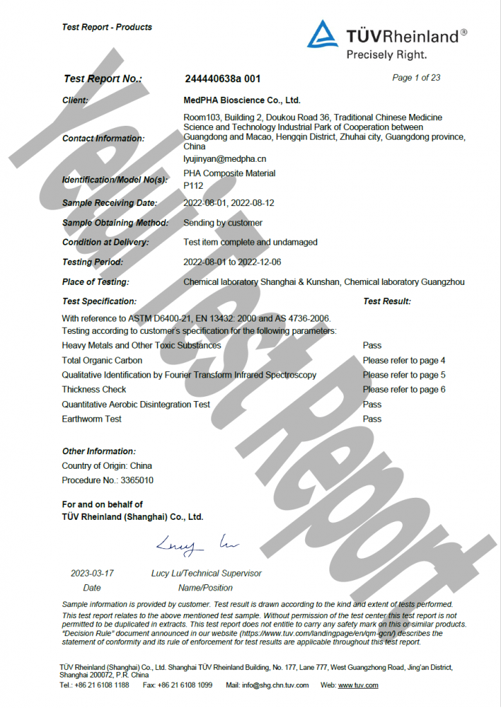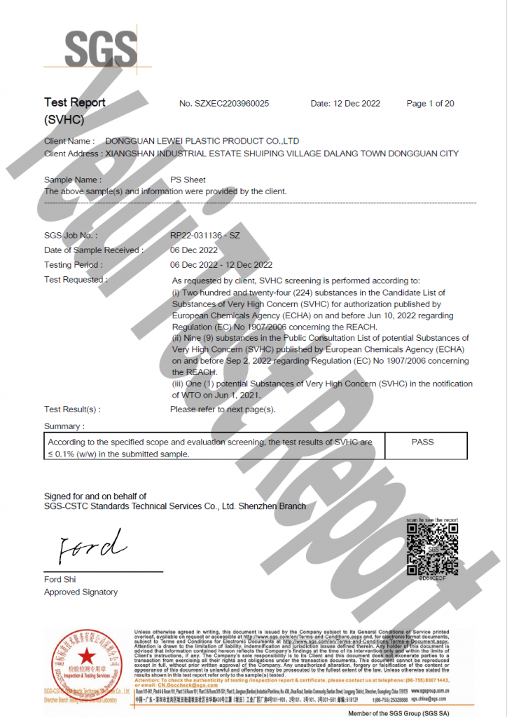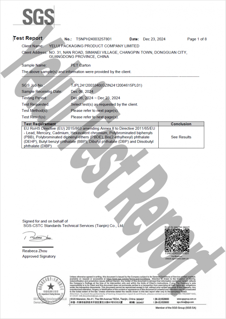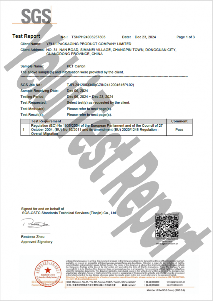 (EC) No 1935/2004, (EU) No 10/2011 & (EU) 2020/1245 test report of PET